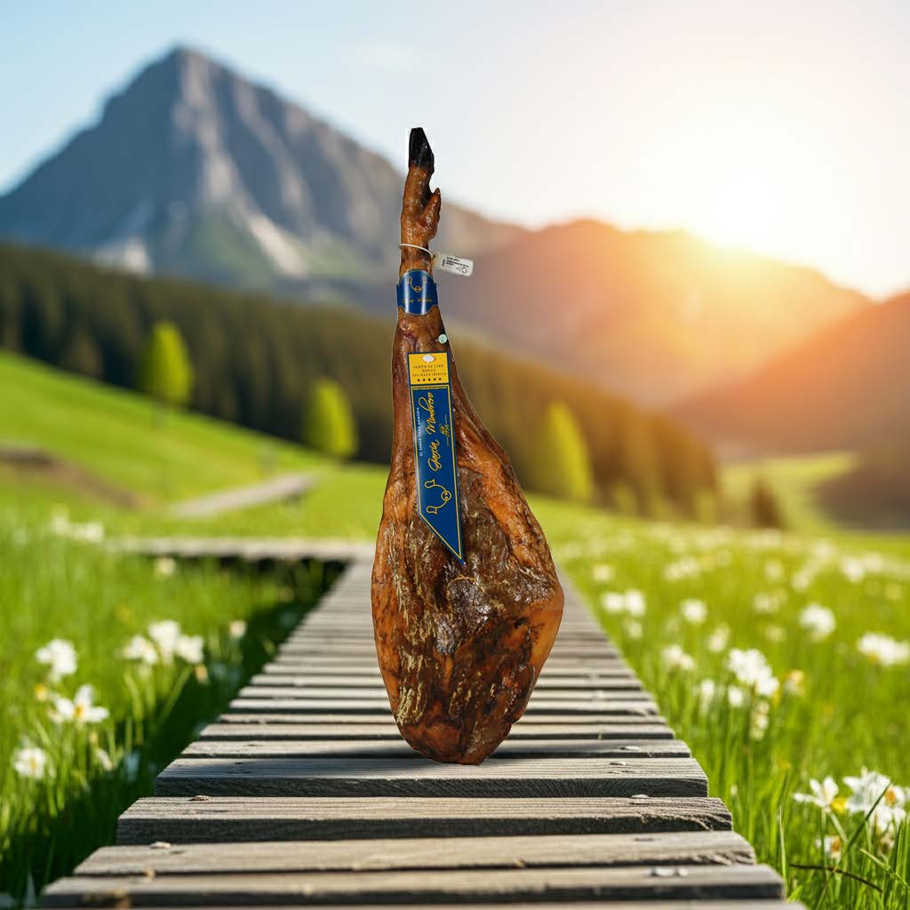 Da maiali iberici allevati in libertà e alimentati con mangimi naturali Stagionatura lenta e naturale in cantina. Profumo intenso e sapore equilibrato con note dolci e salate Consistenza morbida e succosa Disponibile in prosciutto intero, disossato o affettato Ideale per celebrazioni, regali o consumo personale